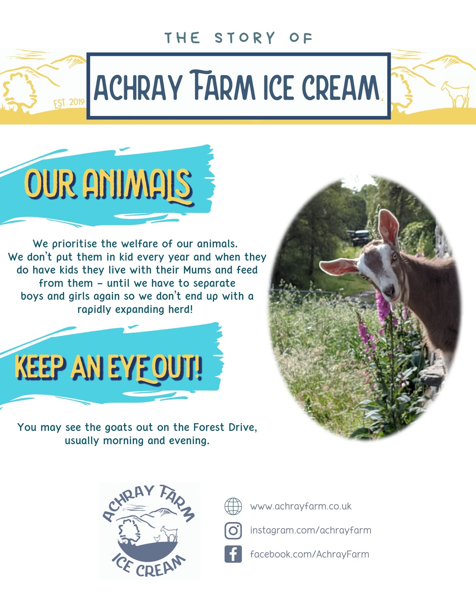 For the school holidays we’ll be open all week, plus weekends and sunny days (almost always!). We have seating at the farm and you may see the goats out in the fields or grazing on the Forest Drive.