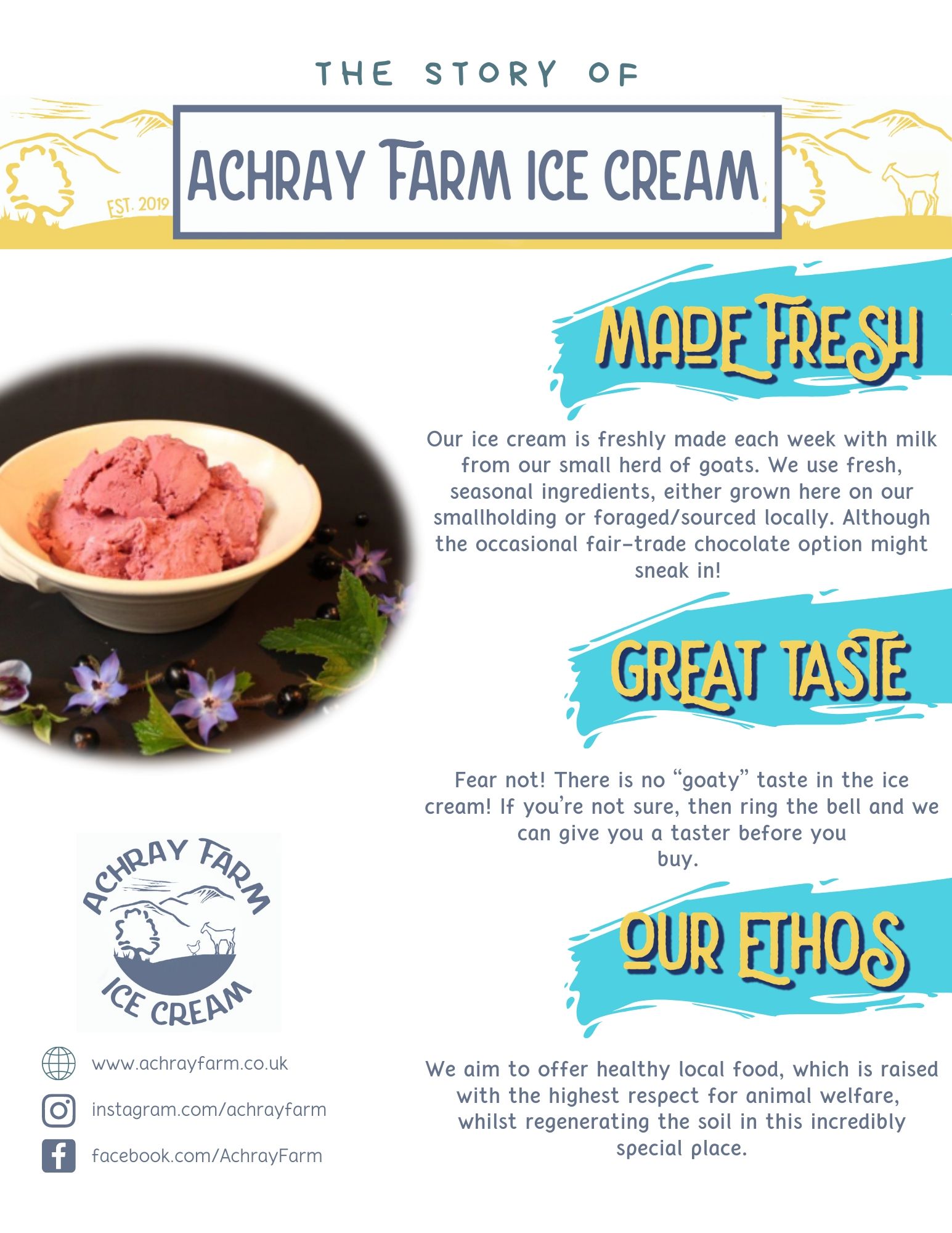 Small batch artisan ice cream and sorbet made from seasonal ingredients and foraged flavours in the Trossachs. You can read more about the process and provenance or our product on the image panels below. New for 2024 are our hands-on Ice Cream Workshops.